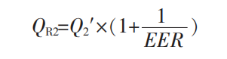 式中:QR1 為巖土體提供熱量;Q1′為建筑空調(diào)總熱負(fù)荷, 2963 kW;cop 為熱泵機(jī)組制熱性能系數(shù),5.0。由式(1)得QR1=2370.4 kW, 即巖土體吸熱量2370.4 kW,滿足建筑供暖需求。巖土體制冷量計(jì)算見式(2)。